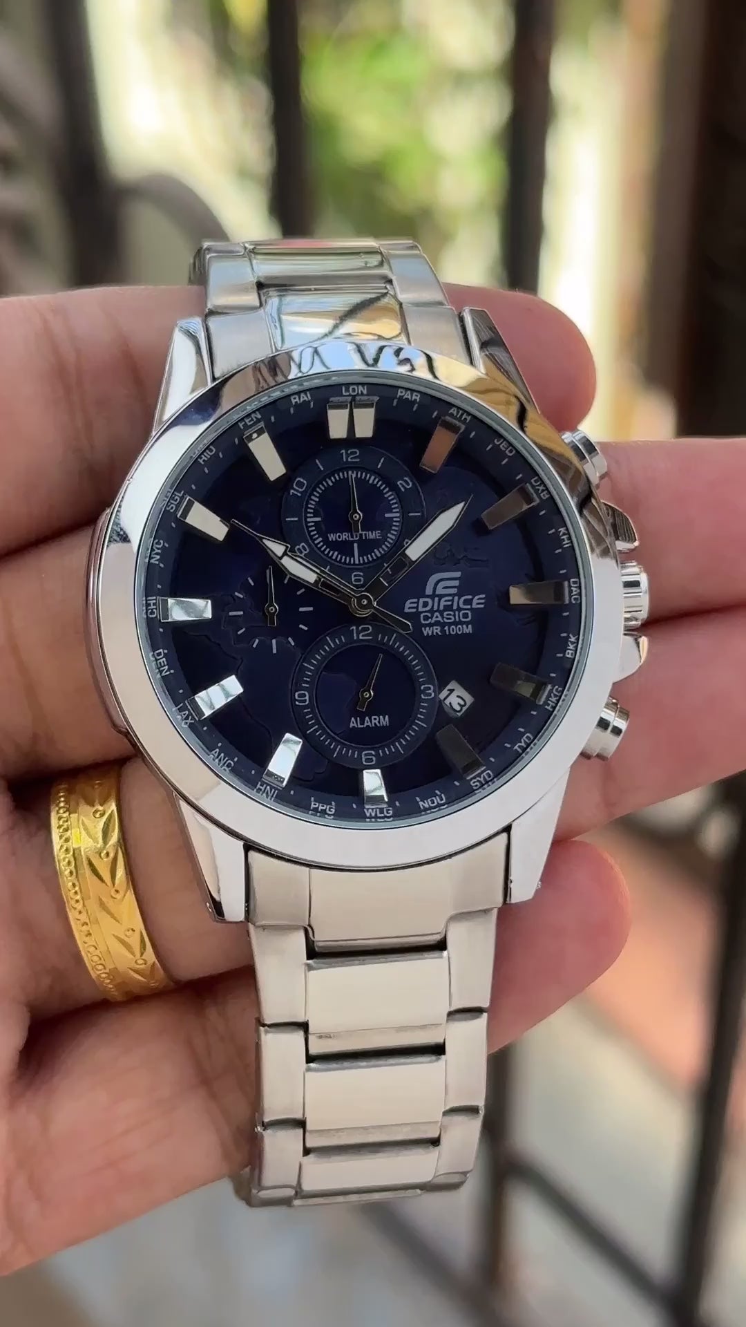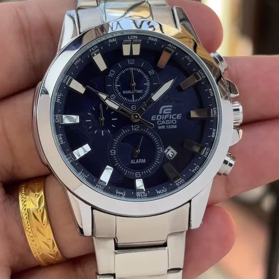 A sophisticated Casio Edifice men's watch featuring a striking Navy Blue dial set within a silver stainless steel case and band. This analogue timepiece boasts chronograph capabilities and useful Dual Dial World Time functionality. With a sturdy mineral glass and 100-meter water resistance, the sporty yet elegant ETD-310D-2AVUDF is built for reliable, global performance and style.